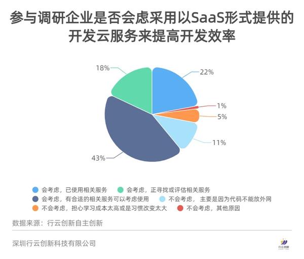 近年来,SaaS模式凭借其用户体验好、使用简单、迭代速度快等的特点,在国内被越来越多的企业用户所认可。在调研的企业中,有83%的企业表示,愿意接受以SaaS形式提供的开发云服务来提高开发效率,说明绝大多数企业都开始对SaaS报以期待,研发上云的大势逼近。其中,已经开始使用SaaS的企业也已经达到了22%,还有61%的企业有可能研发上云,这是一个巨大的市场机会。
