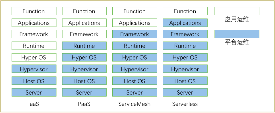 云计算的一个发展方向就是运维下沉,将和业务无关的管理功能和运维工作尽量下沉到基础设施中,应用可以聚焦在业务能力的开发和运营。这个趋势演化的过程,影响了云计算的发展方向。从一开始的虚拟化,到IaaS,到PaaS都是将应用系统的部分运维职责交给平台运维的过程。