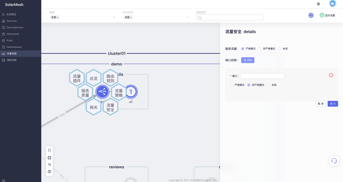 从整体的流量试图中可以看到本地微服务(一个Demo微服务,来自GitHub)的架构组成。每个服务节点都可以点开SolarMesh的控制面板,包括:总览、路由规则、流量策略、流量安全、网关、服务质量、流量插件。