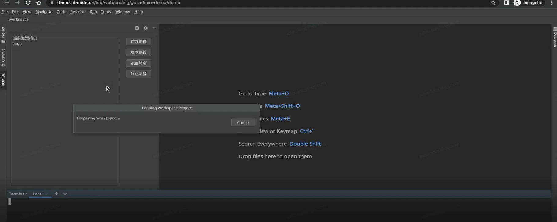 以上是我通过 [TitanIDE] 定制了开箱即用的 Go Admin 开发环境模板,然后使用这个模板一键创建 Go Admin 的开发环境,在短短的 1 分钟内,除了创建项目填写一个项目名称,剩下的就是静静地等待 1 分钟,您无需做其他任何操作,一个完整的 Go Admin 开发环境就呈现在您的眼前了。欲知 [TitanIDE] 的模板是如何开箱即用的,或者您也想定制属于您的开发环境模板,敬请期待下次的分享。