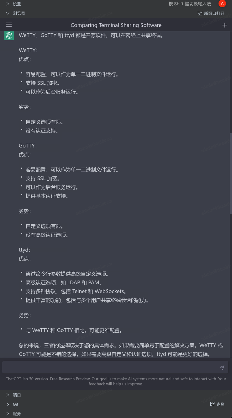 最近,ChatGPT 异常火爆,各行各业的人都在谈论 ChatGPT, 以上是个人对 WeTTY、GoTTY、ttyd 做的横向比较,那 ChatGPT 是怎么看的?请看我在 TitanIDE 和 ChatGPT 的对话: