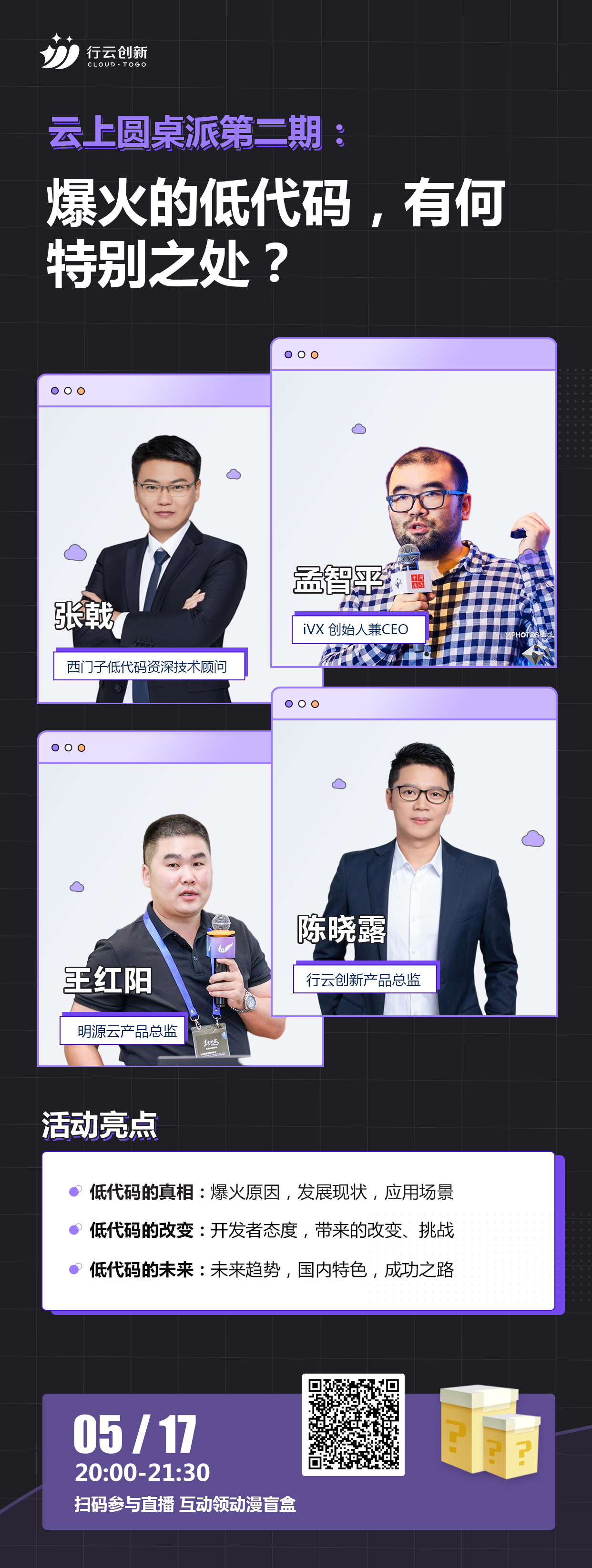 5月17日20:00《云上圆桌派第二期:爆火的低代码,有何特别之处》直播来啦!活动邀请西门子工业软件西门子低代码资深技术顾问张戟,iVX 创始人兼CEO孟智平,明源云产品总监王红阳,ok138cn太阳集团创新产品总监陈晓露四位大咖和ok138cn太阳集团创新CEO马洪喜一起对低代码爆火背后的原因、开发者对低代码的态度、低代码带来的变化和应用场景等多个话题展开讨论。