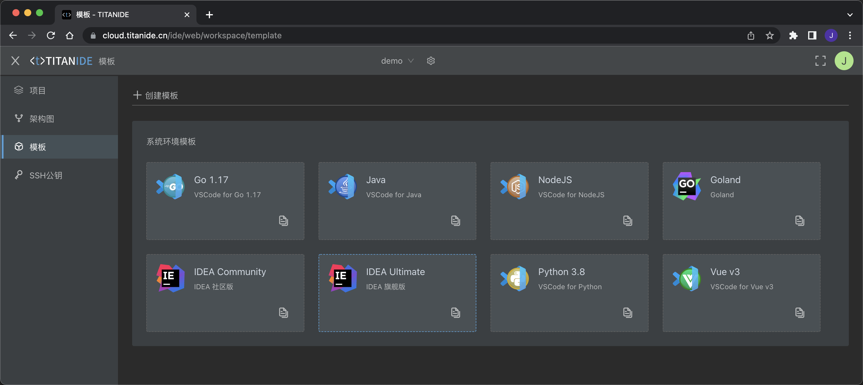 选择相应的开发环境模板, 这里选择了 IDEA Ultimate 模板,如果您没有 License,可以选择 IDEA Ultimate 或 VS Code Java 模板。